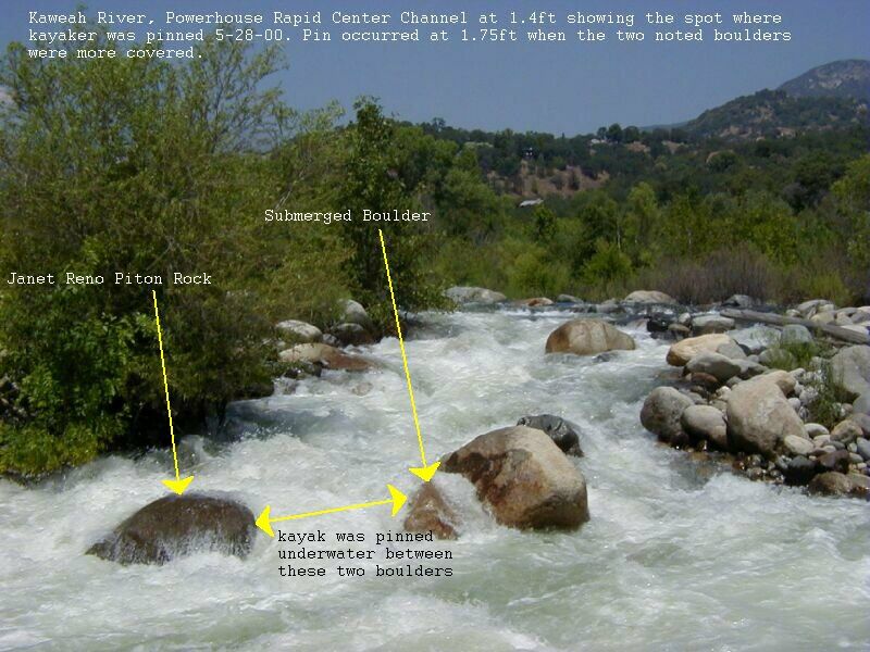 HAZARDOUS CONDITION ALERT! John Stockdell got pinned in Powerhouse 5-28-00 (gauge 1.75ft) on the Janet Reno Piton Rock at the bottom of the center channel. He was trying to exit the left side at the bottom of the drop and T-boned the rock and his boat slid sideways and broached between the Janet Reno Rock and a underwater rock left and upstream of that rock. The bow of his boat was angled to river right with the cockpit facing upstream. He reported that he had a small airpocket in front of his face as he was bent forward on the front deck but was able to free himself with not too much difficulty. He believes he washed under his pinned boat in the exit.. His 2 friends boating with him reported that John was completely underwater and out of sight during the ordeal. They were unable to free his boat that night but recovered the boat intact the next morning below Cyanotic. This is scary stuff! Let it be known that the center channel at Powerhouse is now known to be DANGEROUS and should carry a new level of respect. If you must run this drop please scout it and get right and exit the far right. Click to see where the pin occurred. Update: Powerhouse is even worse at 0.1ft on the gauge. Pinning is much more the possibility.