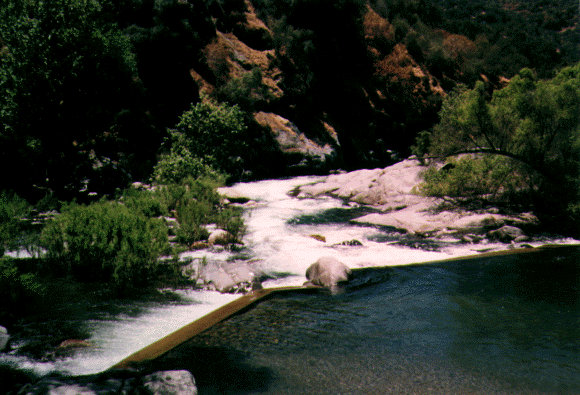 Diversion dam feeding flume to SCE Plant No. 2. Runable at lower flows. Put in above the dam if you like. You be the judge. 85 cfs leaves the river.